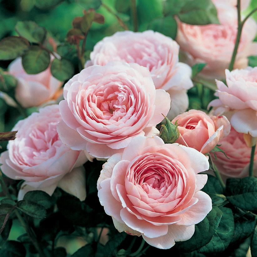 Here we have a rose of exceptional freshness and beauty. The flowers start as charming little buds, gradually opening out to form wide but shallow cups. These are beautiful at all stages, and have a pleasing formality of form.The color is the softest glowing pink with hints of apricot. This rose forms a rather upright and bushy shrub and has attractive Musk Rose foliage that is exceptionally free of disease. The growth is short to medium in height. This is an excellent rose for bedding, borders or for arrangement in the house; the flowers lasting several days in water. Light myrrh fragrance.