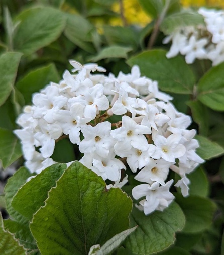 Bridal Wreath Spirea blooms around the same time for a layered effect. Hosta fills ground level with texture. Daylilies provide summer color after the viburnum’s spring show. Boxwood adds evergreen structure in winter. Astilbe works in partially shaded spots nearby.